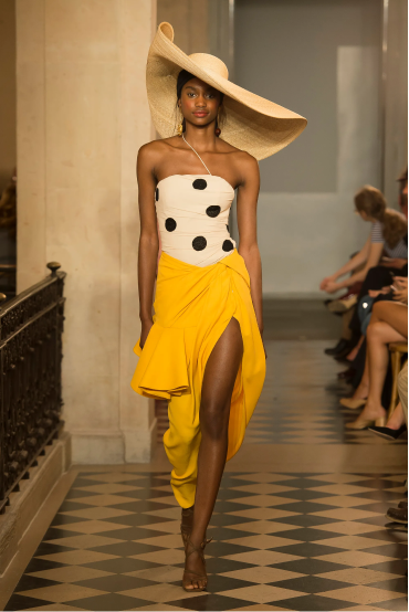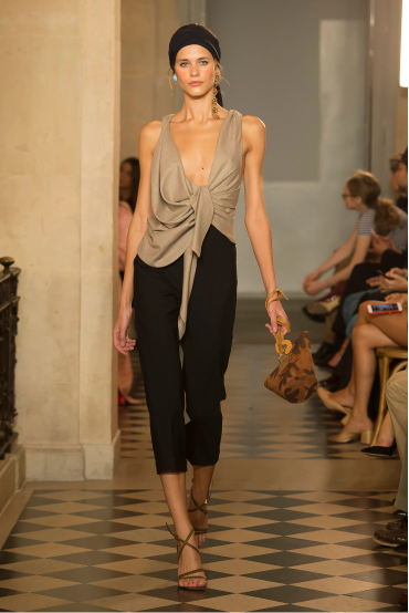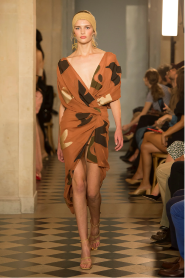The designer was inspired by a photo of his mom returning from the beach. He was impressed by the pareo tied around her hips and large ceramic earrings