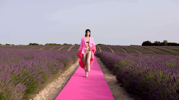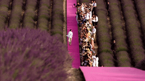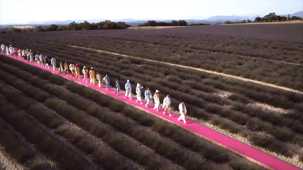 Amidst the lavender fields of Valenceaule in central Provence, not far from the designer’s hometown, a bright pink catwalk stretched across the horizon